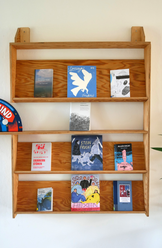 Die Bibliothek bietet Literatur zu den Themen Feminismus und Vielfalt, Antirasissmus/PoC-Perspektiven, Beziehungs- und Lebensweisen, Natur und Ökologie, Kunst und Architektur sowie Literatur von DDR-Autorinnen. Ausserdem gibt es eine kleine Auswahl an Kinder- und Jugendbüchern, Comics, Lyrik, Science Fiction und Texten aus der und über die Region (Böckenberg, Uckermark, Brandenburg, Polen). Perspektivisch wächst das werkarchiv libken heran.